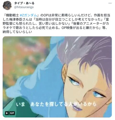 『機動戦士 #Zガンダム』のOPは非常に素晴らしいんだけど、作画を担当した梅津泰臣さんは「当時は自分が目立つことしか考えてなかった」「富野監督にも怒られたし、苦い思い出しかない」「後輩のアニメーターがカラオケで歌おうとしたら必死で止める。OP映像…